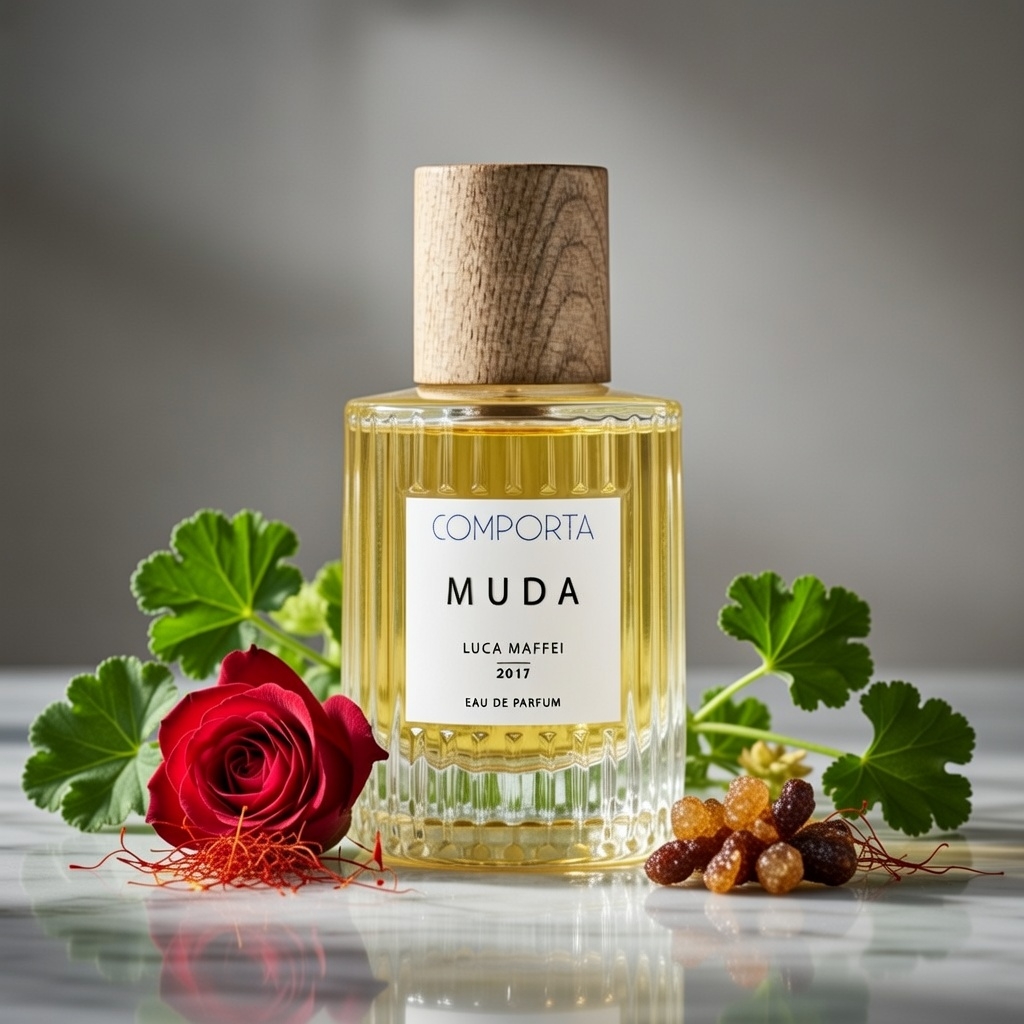 Dedicated to the founder's wife and inspired by mesmerizing sunsets turning into night parties, Muda by Comporta Perfumes evokes a hostess greeting friends for dinner—warm, inviting, and full of golden light. It captivates oriental and floral fans with its citrusy-earthy sophistication and subtle metallic edge. This Eau de Parfum delivers solid longevity (often 7-9+ hours) and moderate sillage that projects warmly before evolving into an enveloping, skin-like aura.
