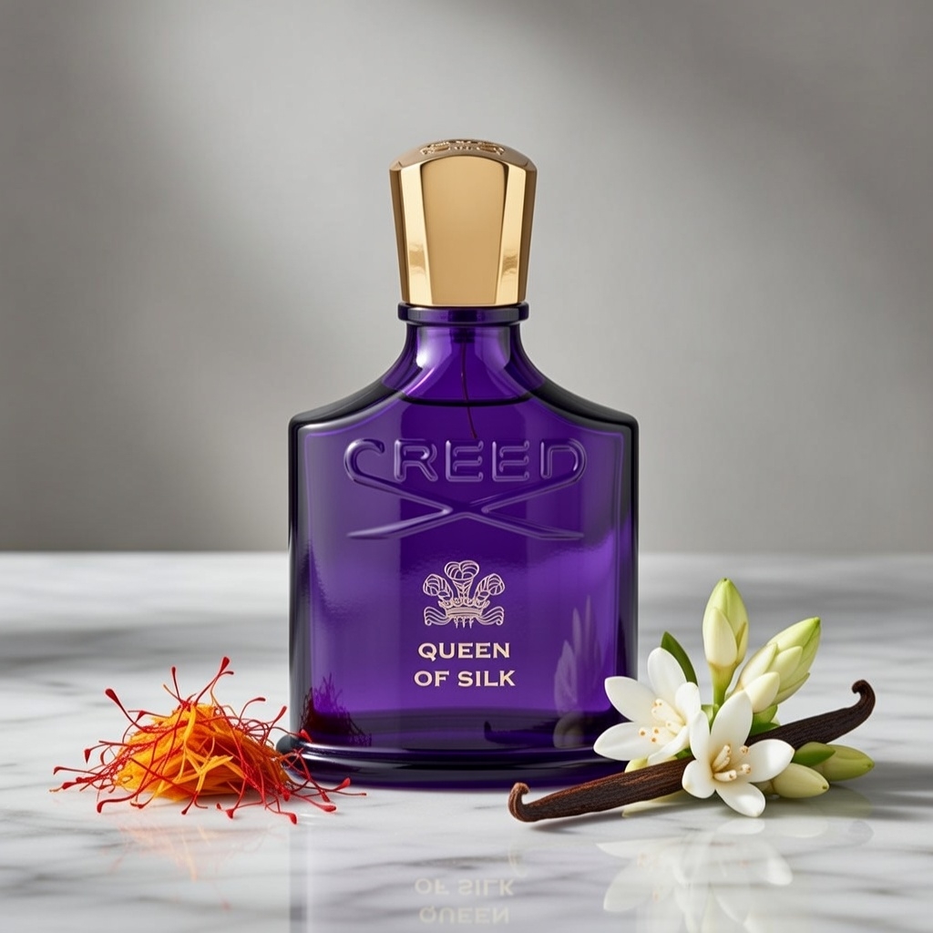 Queen of Silk opens with a radiant, spiced burst of saffron, Chinese osmanthus, and magnolia—delivering creamy, apricot-like floral warmth with luminous vibrancy. The heart reveals decadent depth through tuberose, passionfruit, Javanese patchouli, and agarwood (oud)—blending seductive white florals, tart fruit, and earthy woods for plush sophistication. It dries down to a velvety, addictive base of Madagascar vanilla, Ambroxan, myrrh, musk, incense, and cedarwood—creamy, resinous, and subtly smoky with that signature Creed polish and enduring allure.