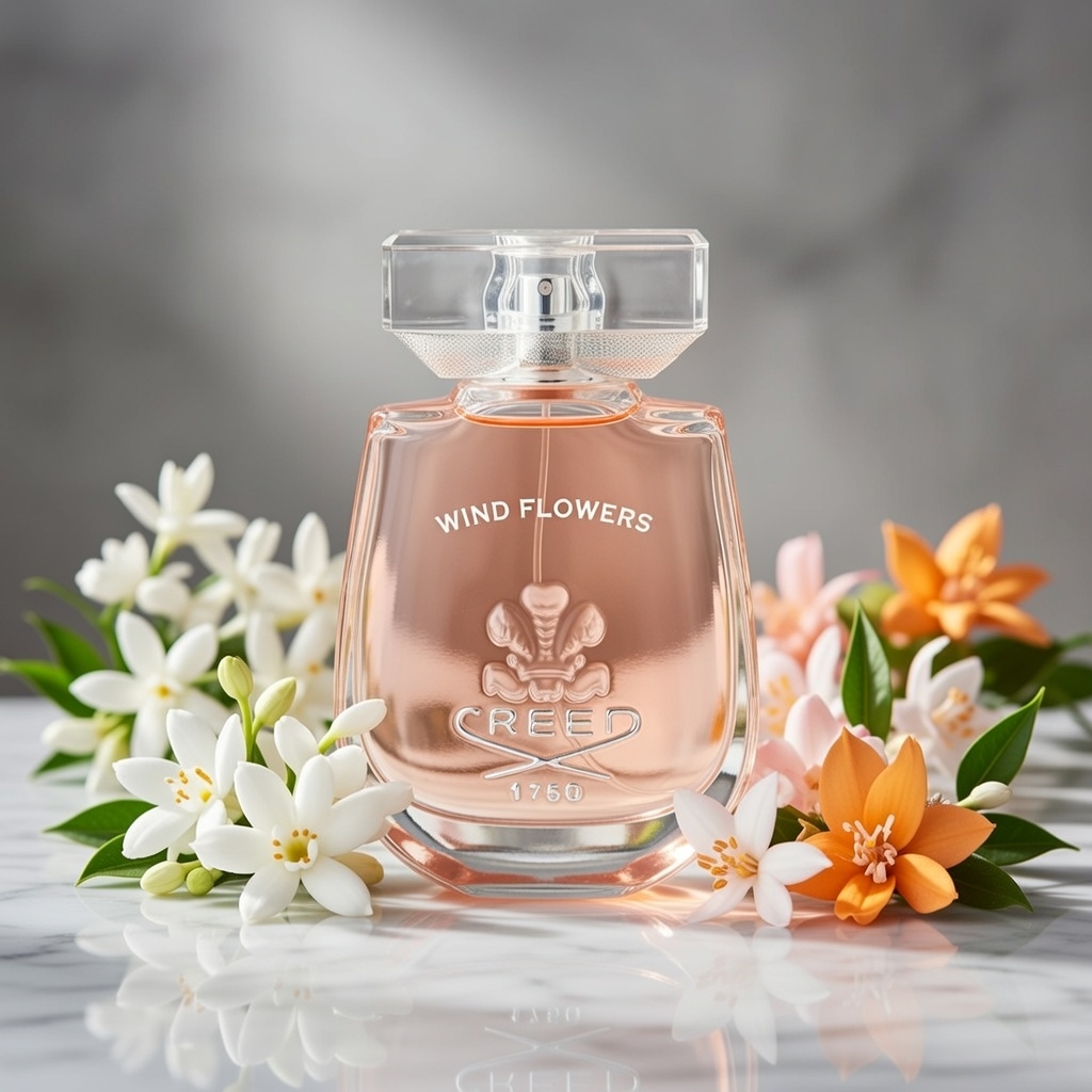 Wind Flowers opens with a fresh, inviting burst of jasmine, orange blossom (Tunisian), and peach—delivering sweet, zesty floral-fruity radiance that feels airy and uplifting. The heart blooms with opulent depth through jasmine sambac, tuberose absolute, and rose (Centifolia or de Mai)—adding creamy, plush white floral sophistication. It dries down to a warm, addictive base of musk, orange blossom, praline, iris, and sandalwood—velvety, gourmand, and subtly woody with that signature Creed refinement.