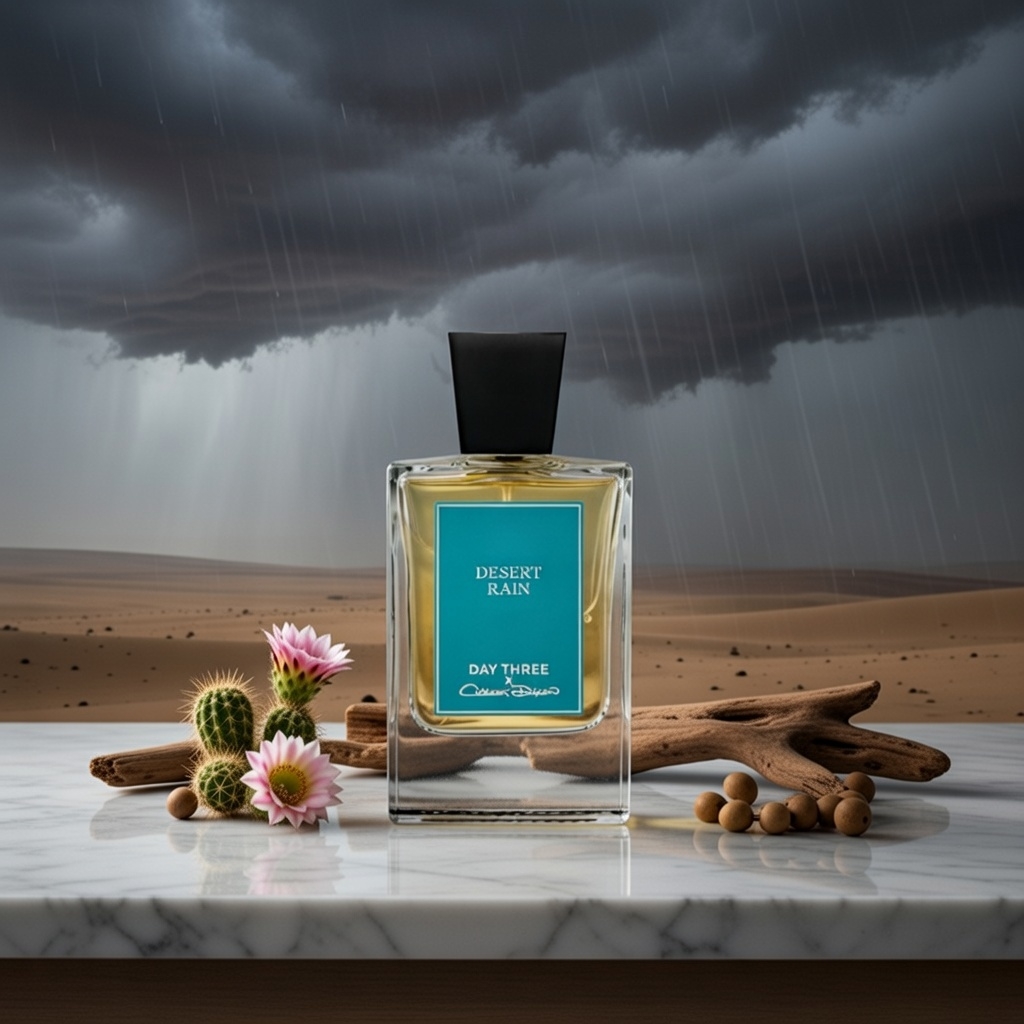 Capture the magic of transformation with Day Three Desert Rain, the evocative aromatic fougère fragrance launched in 2025 by the award-winning artisanal house Day Three Fragrances. Crafted by perfumer Michael Paul in collaboration with singer-songwriter Colton Dixon (inspired by his hit song "Build a Boat"), this unisex masterpiece embodies the rare, hopeful moment when desert silence breaks into rain-drenched renewal—fresh juniper, blooming cactus, and earthy petrichor layered over sage-washed accords for a meditative, soul-soothing escape.