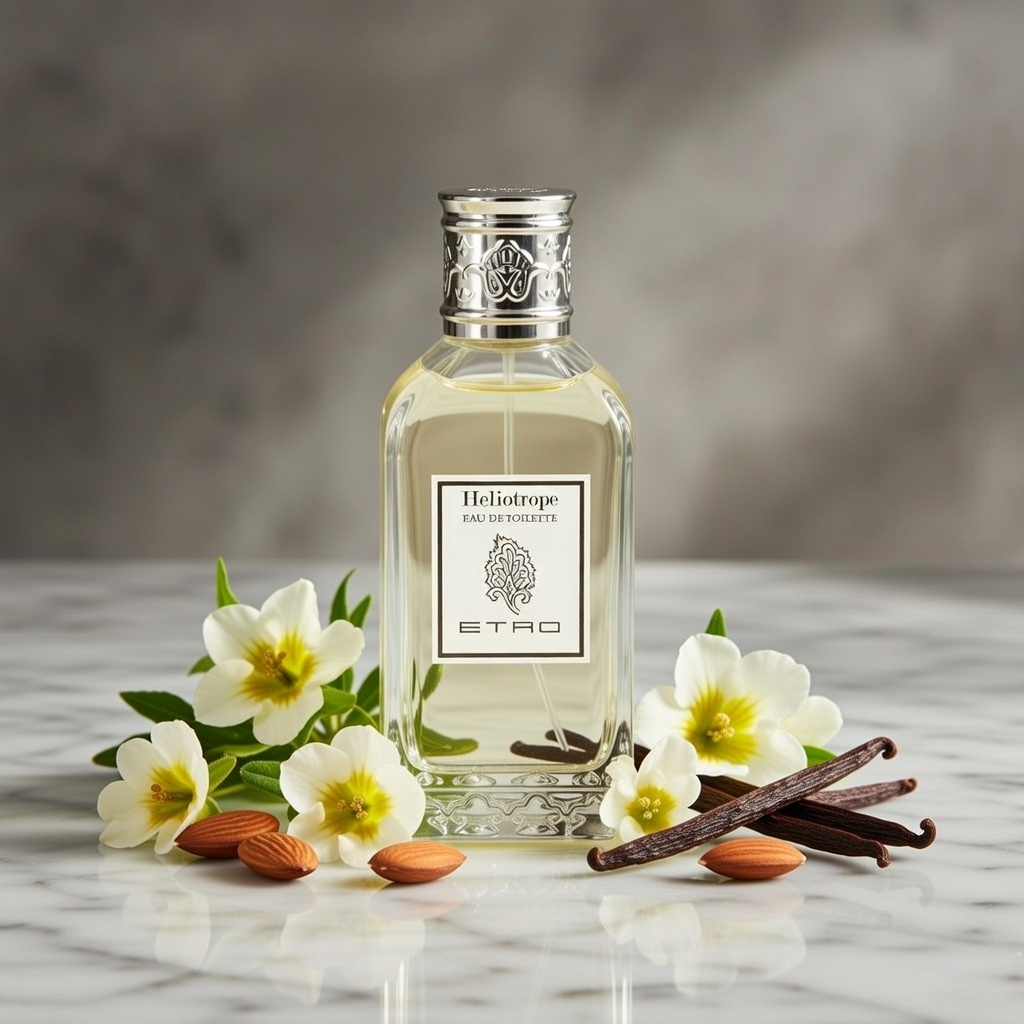 Unveil timeless, poetic luxury with Etro Heliotrope, the enchanting Eau de Toilette launched in 1989. This oriental floral masterpiece celebrates the delicate heliotrope flower—powdery, almond-like, and subtly cherry-pie sweet—blended with bitter almond, orange blossom, iris, ylang-ylang, and a warm base of vanilla, tonka bean, and balsamic resins for a tender, romantic, and ethereal aura. It's light yet enveloping, powdery yet fresh, gourmand-leaning yet airy—like a fluffy marzipan pastry dusted with confectioners' sugar and blooming white flowers under a Mediterranean sun, intimate and endlessly charming.