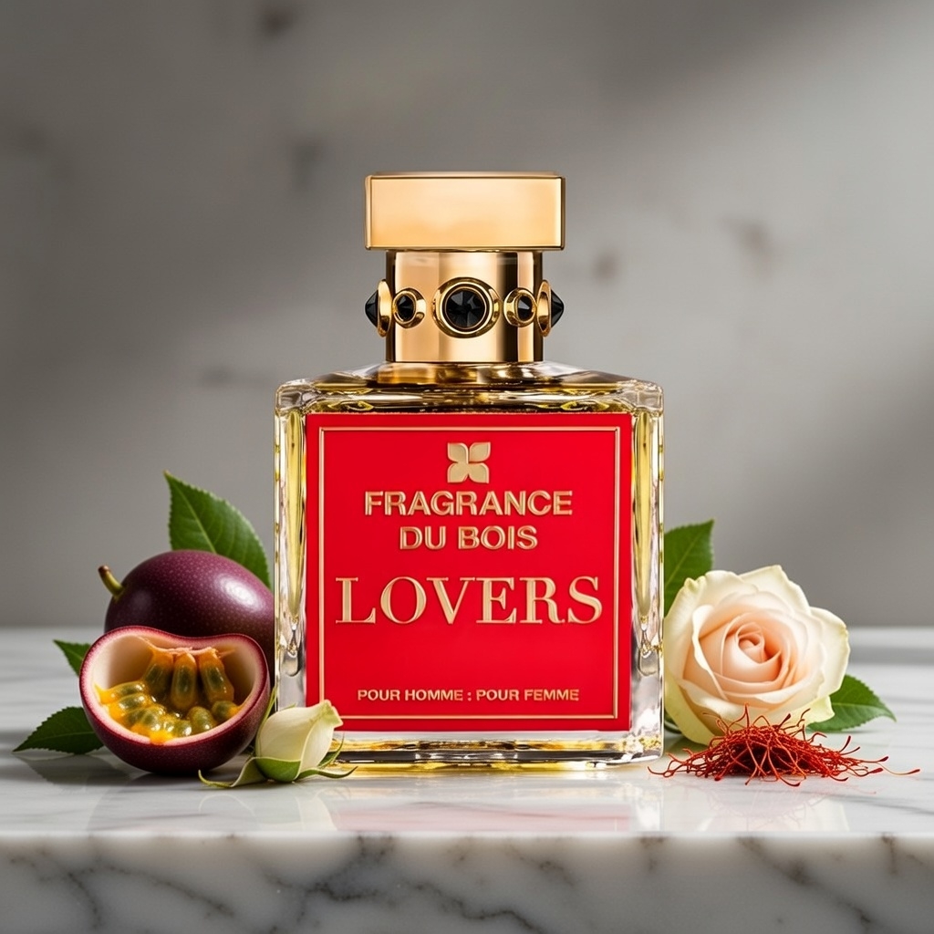 Unveil sensual, romantic luxury with Fragrance Du Bois Lovers, launched in 2023 as a Floral Fruity Extrait de Parfum crafted by Shadi Samra to capture the bliss of intimate moments and shared pleasure. This floral fruity masterpiece blends juicy passionfruit, plum, fiery ginger, and bergamot with lush rose, saffron, and jasmine, then grounds in rich patchouli, cashmere wood, cedarwood, sandalwood, and vetiver for a vibrant, warm, and elegantly seductive aura. It's fruity yet spicy, floral yet woody, passionate yet refined—like a burst of tropical passionfruit mingling with spicy ginger over blooming rose petals and saffron spice, settling into a soft cashmere-woody embrace in a candlelit rendezvous, intimate and endlessly charismatic.